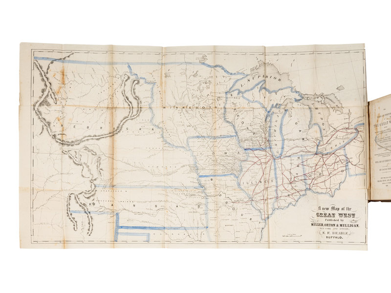 12mo. Folding map frontispiece with hand-coloring, engraved plates, 4pp. publisher's advertisements at rear. (Some occasional spotting and offsetting, light creasing to map). Original brown cloth gilt, stamped in blind (a touch of wear to spine ends, corners lightly bumped, some minor soiling). Provenance: V.J. Messinger (signature, Canton, Massachusetts, 1859); Dudley Bell Priester (1923-2017), Mississippi River collector and bibliographer (sold Bloomsbury, 20 November 2009, lot 77). FIRST EDITION, with descriptions of a variety of Mississippi Valley regions from Ferris' personal observations. Buck 565; Graff 1309; Sabin 24192, Wagner-Camp 274a.