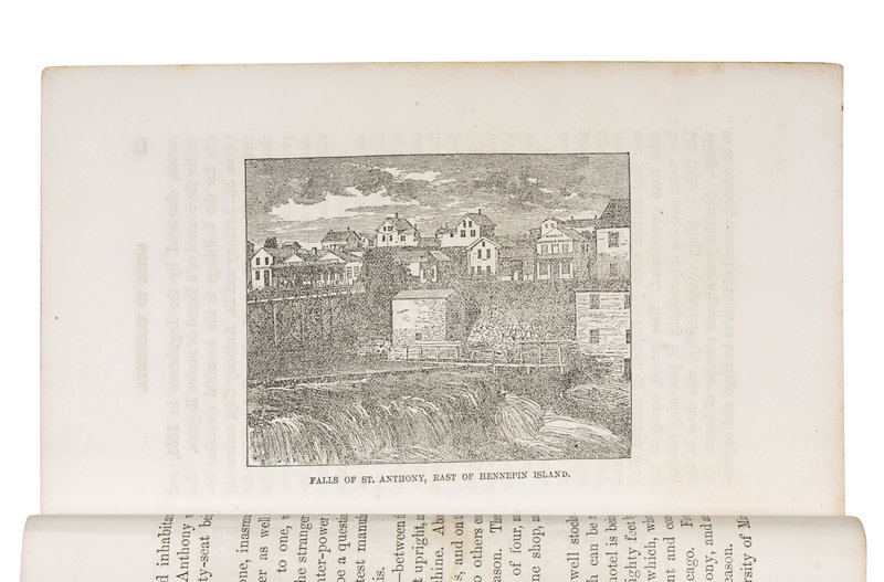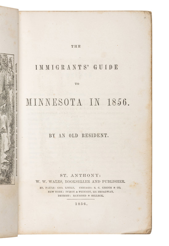 [With:] [WALES, W.W., Publisher]. The Immigrant's Guide to Minnesota in 1856. By an Old Resident. St. Anthony, MN et al: W.W. Wales et al, 1856. 12mo. Engraved frontispiece, 3 woodcut plates and map; 11pp. publisher's advertisements at end. (Lacking folding map, some occasional spotting.) Original printed yellow wrappers (some soiling, fading, and minor chipping). Provenance: Sarah E. Foster (signature); Dudley Bell Priester (1923-2017), Mississippi River collector and bibliographer (sold Bloomsbury, 20 November 2009, lot 127). FIRST EDITION of one of the earliest guides to Minnesota, with extensive information about distances, towns, resources, and regional history to aid immigrants traveling to Minnesota in 1856. The wood-engraved map depicts Lake Minnetonka. Eberstadt 115-0719; Graff 2092; Howes M-644; Sabin 34366, 49253.