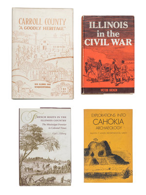 BREESE, Sidney (1800-1878). Early History of Illinois. Chicago: E.B. Myers & Company, 1884. Publisher's brown cloth gilt. FIRST EDITION. Bradford 532. -- CRITCHELL, Robert S. (1844-1919) Recollections of a Fire Insurance Man. Chicago: By the Author, 1909. Publisher's blue cloth gilt. -- FLANDERS, Robert Bruce (1930-2021). Nauvoo: Kingdom on the Mississippi. Urbana: University of Illinois Press, 1965. -- LANDRUM, Carl A. (1915-2003) Quincy in the Civil War. Quincy: By the Author, 1966. Publisher's printed wraps. FIRST EDITION. -- LOVEJOY, Joseph C. (1805-1871) and LOVEJOY, Owen (1811-1864). Memoir of the Reverend Elijah P. Lovejoy. New York: John S. Taylor, 1838. Contemporary half calf. -- PERRIN, J. Nick. History of Illinois. Springfield: [The author], 1906. Publisher's buff cloth. INSCRIBED BY AUTHOR. -- REED, Charles Bert (1866-1940). Masters of the Wilderness. Chicago: The University of Chicago Press, 1914. Publisher's brown cloth. INSCRIBED BY AUTHOR. -- And 46 others. Together, 53 works in 53 volumes, various 8vo and 4to sizes, condition generally fine. Provenance for the lot: Dudley Bell Priester (1923-2017), Mississippi River collector and bibliographer (sold Bloomsbury, 19 November 2009, lot 86). Complete list available on request.