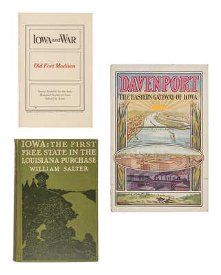 CRAM, Ralph Warren (ed.) (1869-1952). History of War Activities of Scott County, Iowa 1917-1918. [N.p.]: The Scott County Council of National Defense, [n.d.]. Publisher's blue cloth. -- FICKE, Charles August (1850-1931). Memories of Fourscore Years. Davenport: Graphic Services, Inc., 1930. Publisher's black cloth gilt. INSCRIBED BY CHARLES AUGUST FICKE. -- MAHAN, Bruce E. (1890-1972). Old Fort Crawford and the Frontier. Iowa City: State Historical Society of Iowa, 1926. Publisher's red cloth gilt. -- PETERSEN, William J. (1929-2021). The Story of Iowa: The Progress of an American State. New York: Lewis Historical Publishing Co., Inc., 1952. 4 volumes. Publisher's red cloth gilt. -- PURCELL, W.L. Them Was the Good Old Days. [N.p.]: Prcell Printing Company, 1922. Publisher's brown cloth. -- SAGE, Leland L. (1899-1989) A History of Iowa. Ames: University of Iowa Press, 1974. Publisher's blue cloth; dust jacket. FIRST EDITION. -- SALTER, William (1821-1910). Iowa: The First Free State in the Louisiana Purchase. Chicago: A.C. McClurg & Co., 1905. Publisher's pictorial green cloth. Provenance: Harry Platner (gift inscription). -- And 46 others. Together, 53 works in 57 volumes, various 8vo and 4to sizes, condition generally fine. Provenance for the lot: Dudley Bell Priester (1923-2017), Mississippi River collector and bibliographer (sold Bloomsbury, 19 November 2009, lot 87). Complete list available on request.