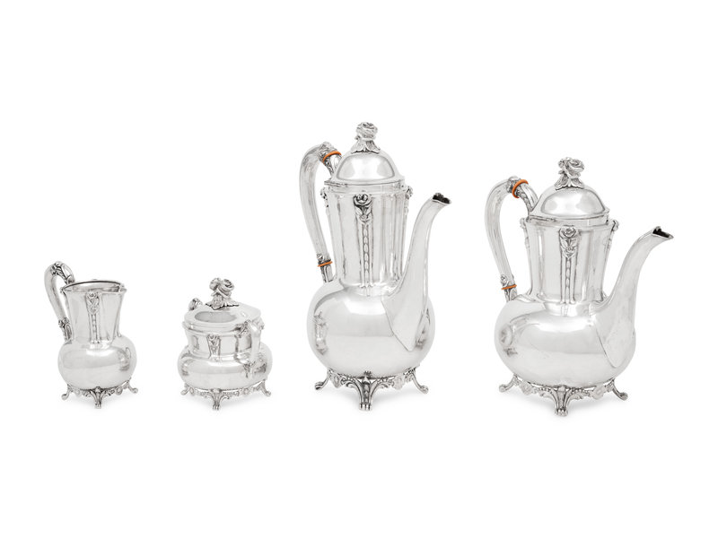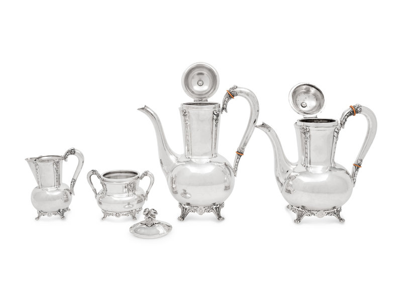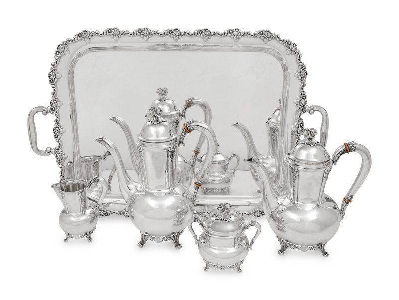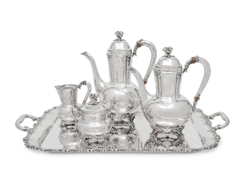 comprising a coffee pot, teapot, covered sugar and creamer, together with an associated silver-plate tray; 5 items total.