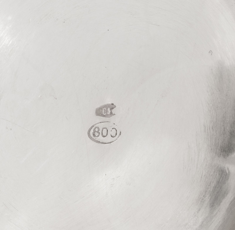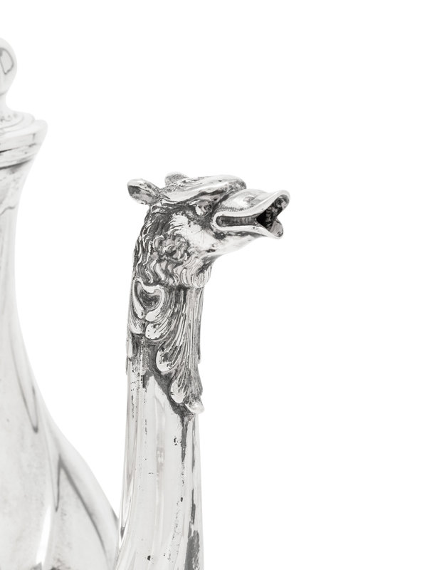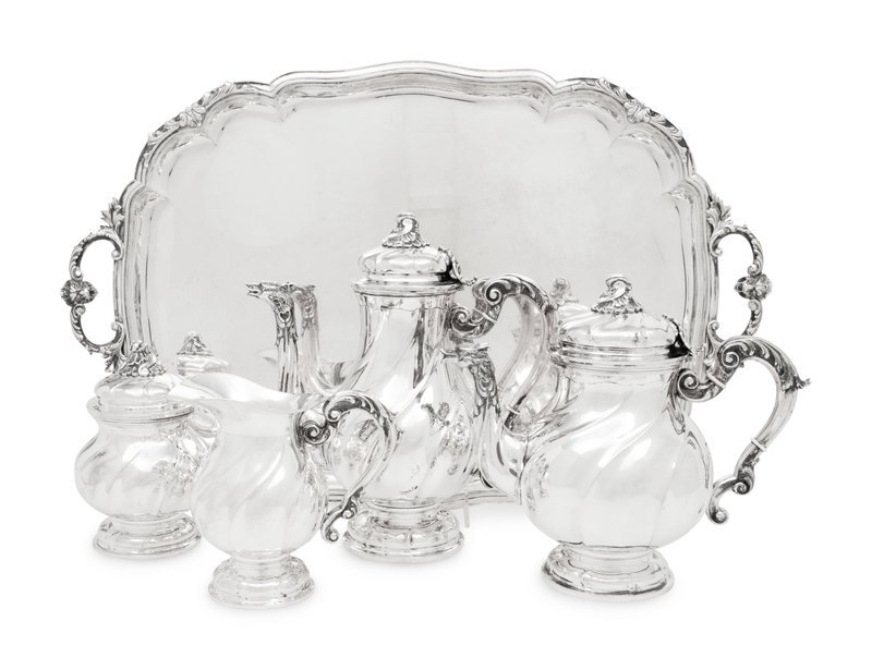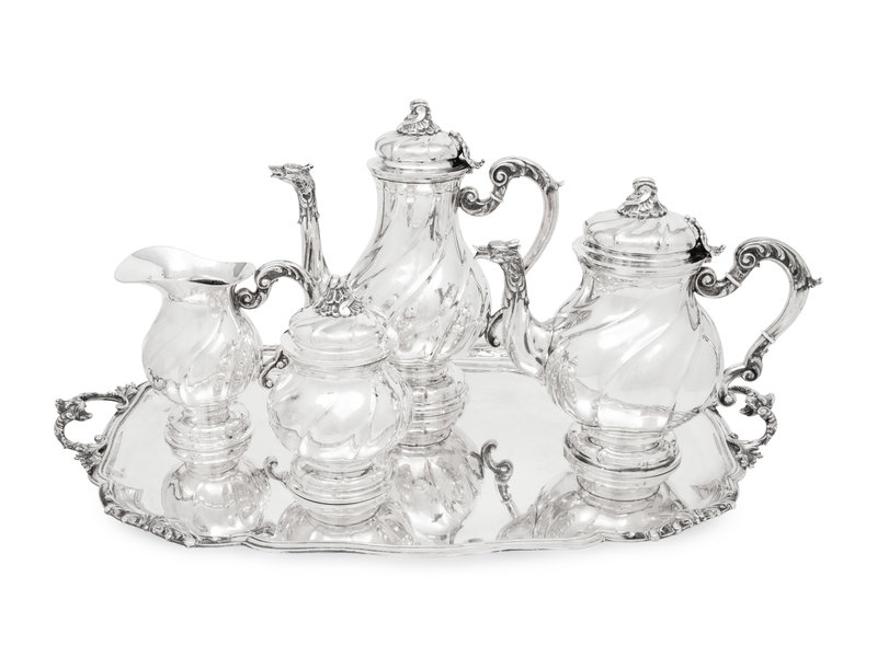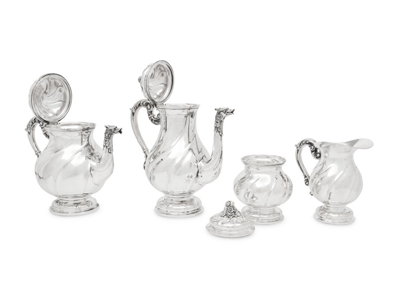 comprising a teapot, coffee pot, creamer, covered sugar and tray, the spouts with dragon terminals, the bodies with twisting ribs and the handles of the tray with grotesque masks.