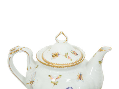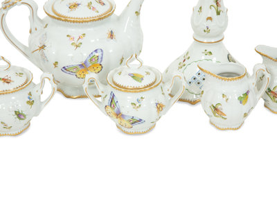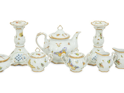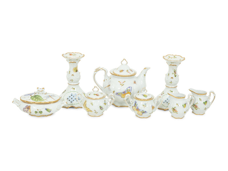 comprising a pair of candlesticks, a teapot, two creamers, two covered sugars, and a covered oval dish; 8 items total.