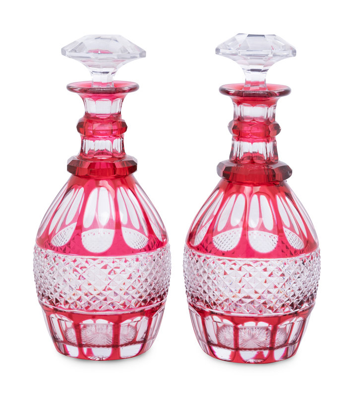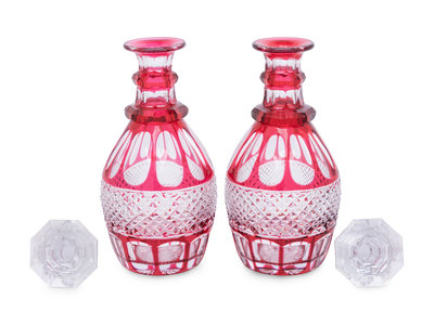 A Pair of Bohemian Red Cut-to-Clear Glass Decanters