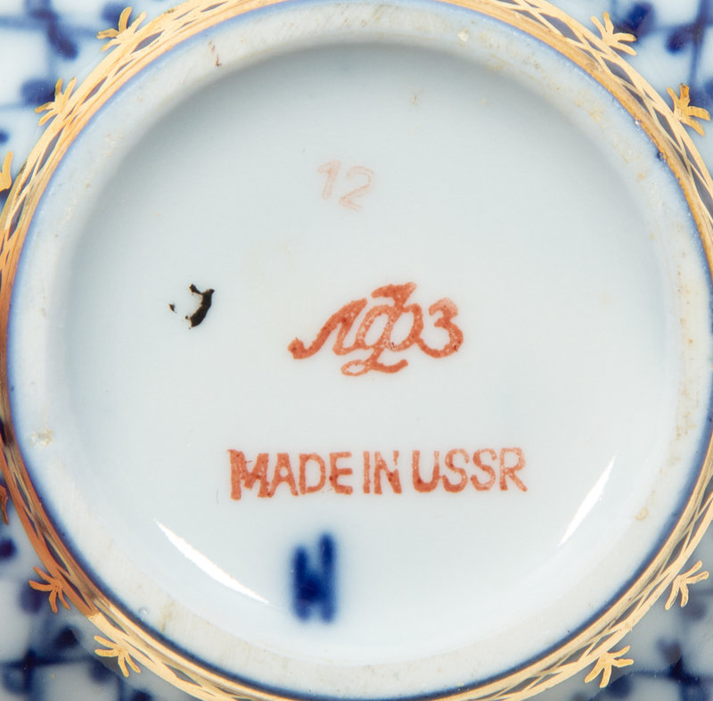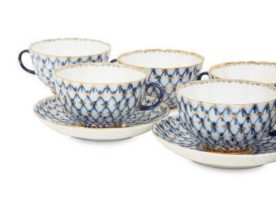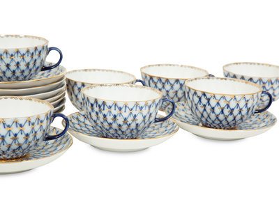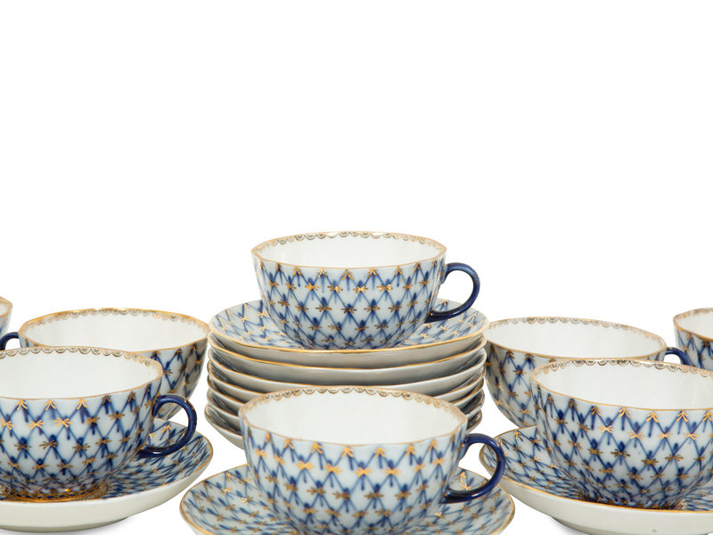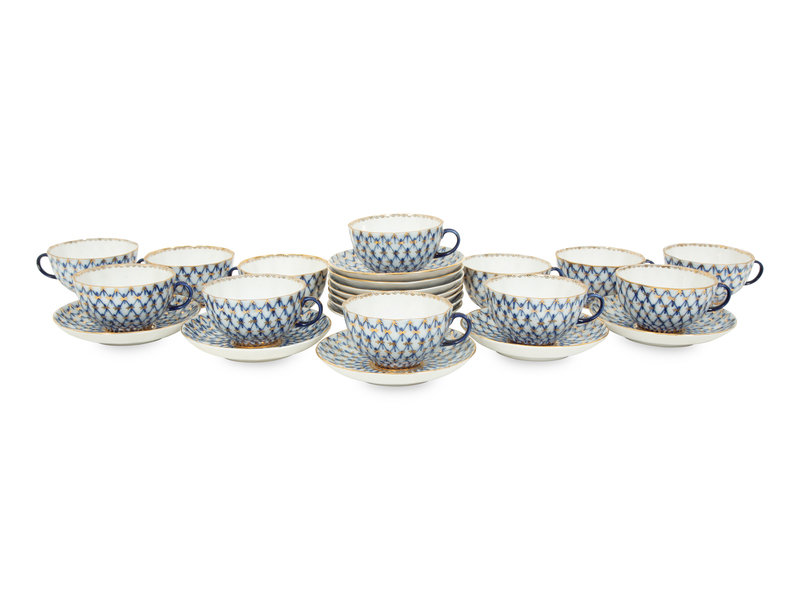 A Set of Twelve Lomonosov Cobalt Net Porcelain Teacups and Saucers