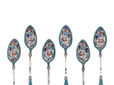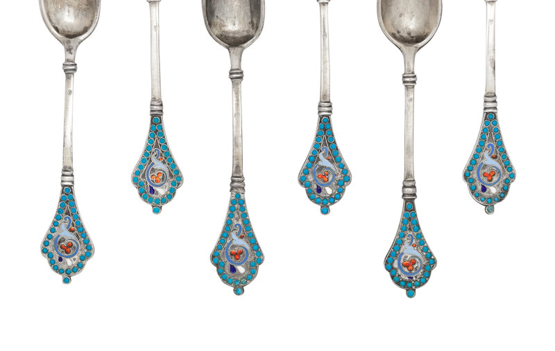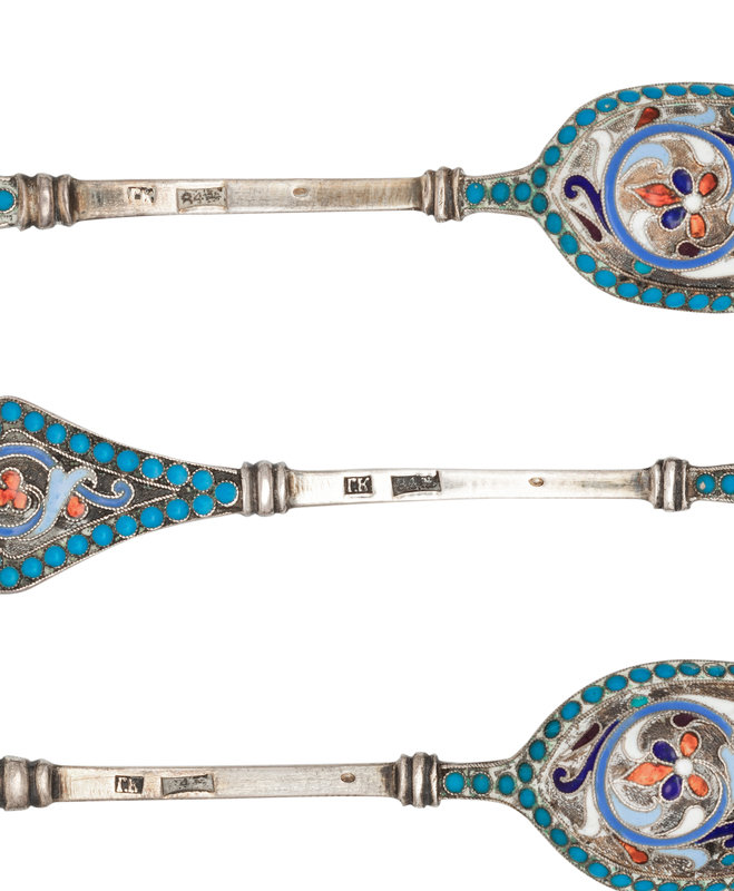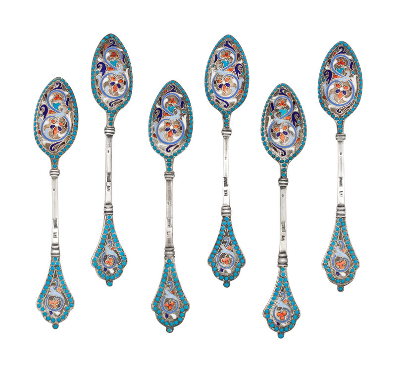 A Set of Six Russian Enameled Silver Coffee Spoons