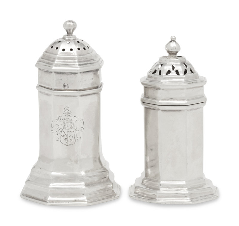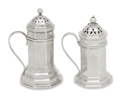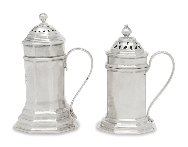 Two Queen Anne Britannia Silver Pepper Boxes