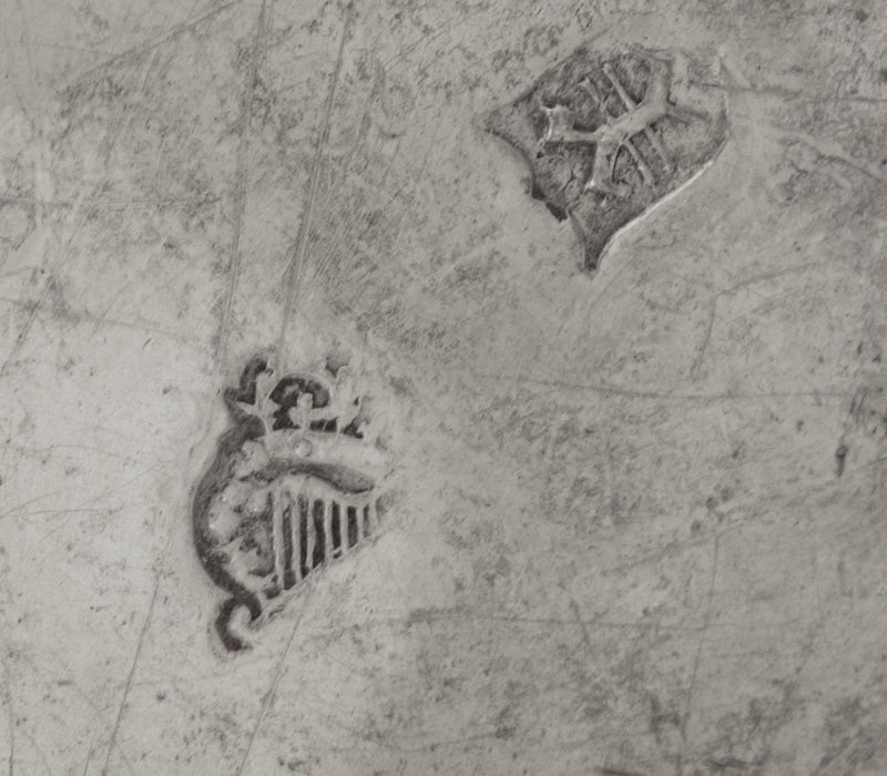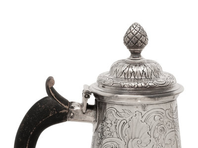 the body with an engraved shield crest for the Blennerhassett family within a repoussé-decorated body with scroll, floral and animal motifs.