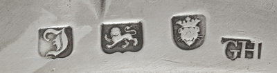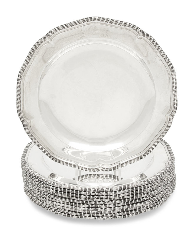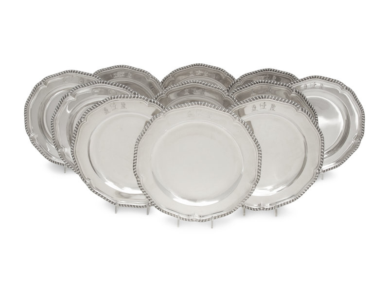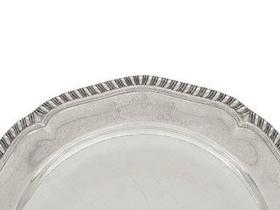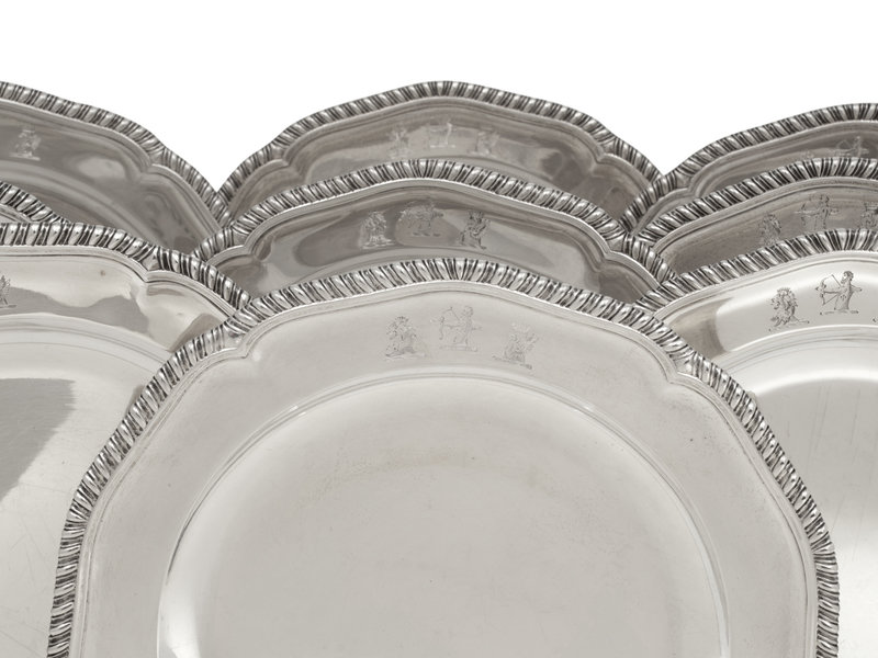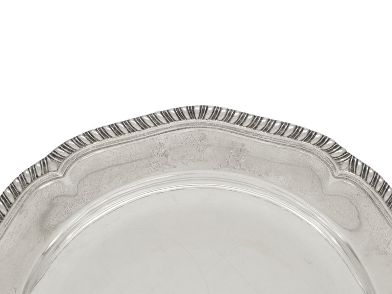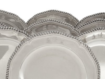 having a shaped gadroon rim with three engraved crests on border, the undersides with a bright-cut inventory number and weight.
