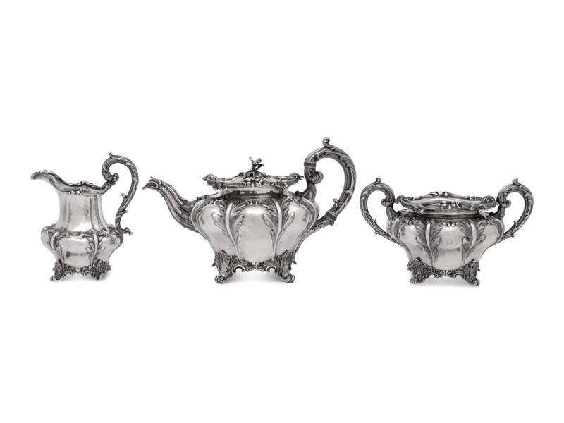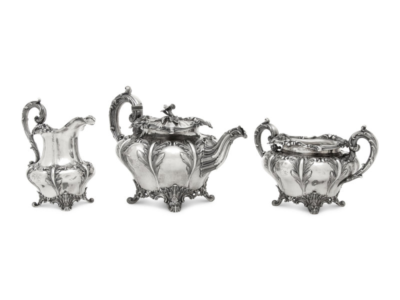 each hallmarked for Sterling to underside, the teapot further numbered '496', the creamer numbered '147' and the sugar numbered '932'