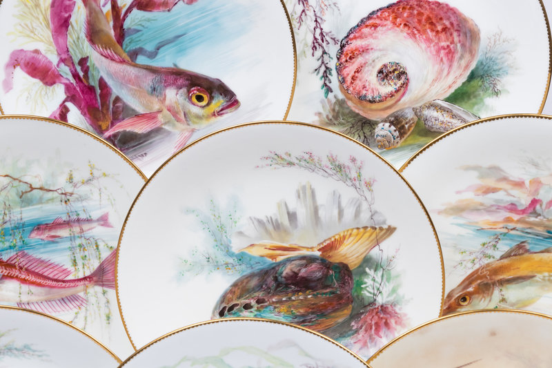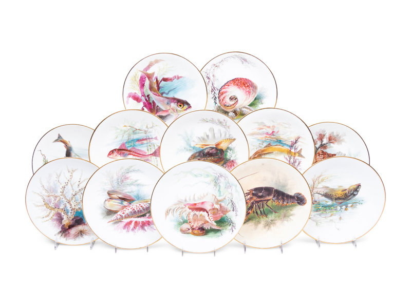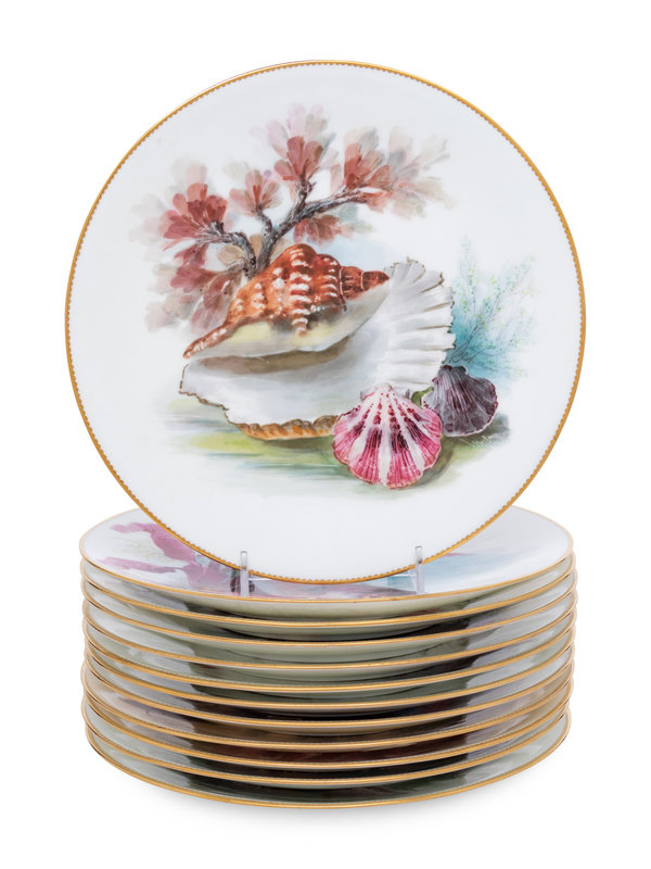 A Set of Twelve Mintons Parcel-Gilt Porcelain Fish and Shell Plates