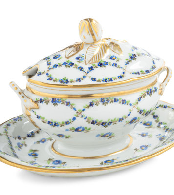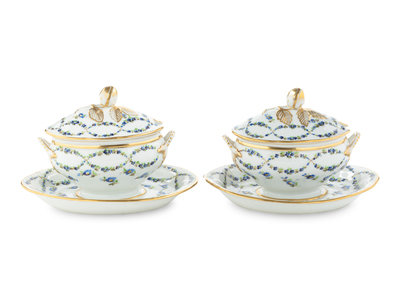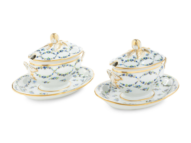 A Pair of English Porcelain Covered Sauce Tureens with Attached Underplates