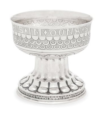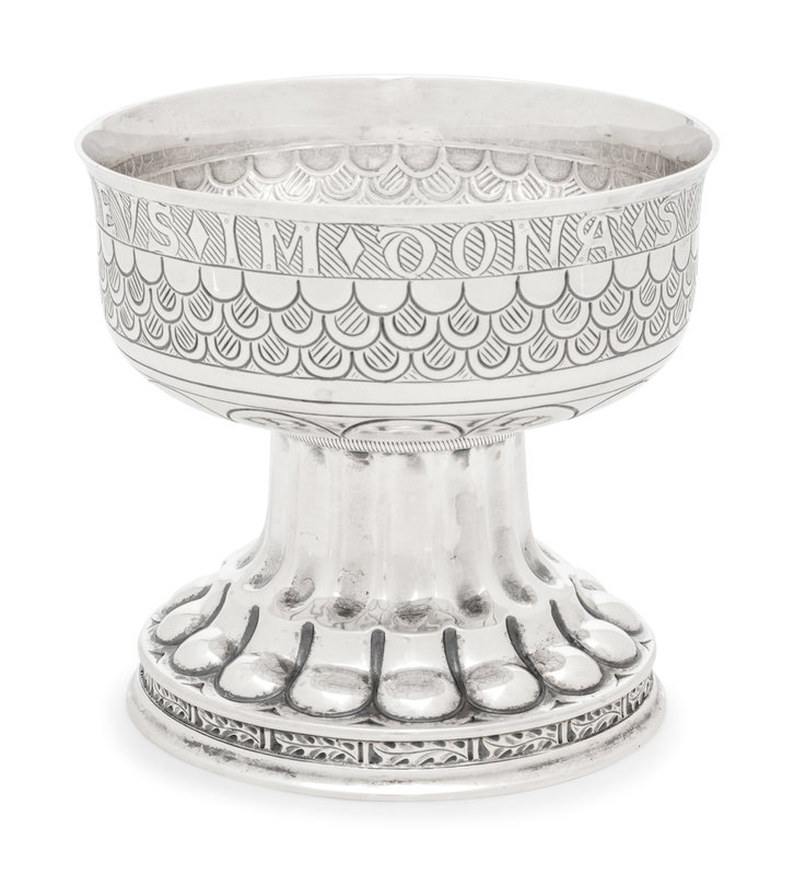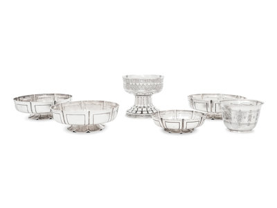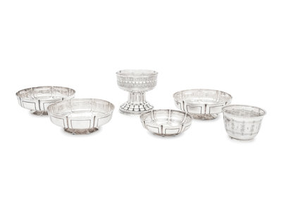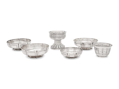 comprising a set of three sweetmeat dishes marked for Crichton Bros., London, 1914-1915; a smaller similarly decorated example marked for William Corke, London, 1902; a compote marked for William Hutton & Sons Ltd., London, 1902 and a small bowl marked for Liberty and Co., Birmingham, 1919.