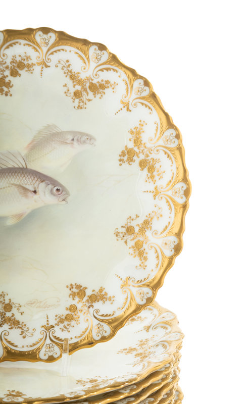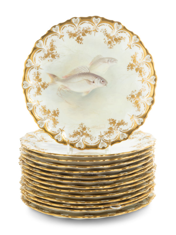A Set of Fourteen Royal Doulton Parcel-Gilt Porcelain Fish Plates