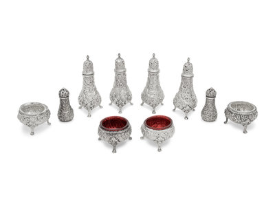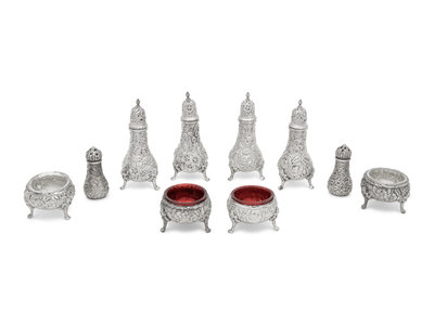 comprising four footed casters, four salt cellars and two smaller casters; 10 items total.
