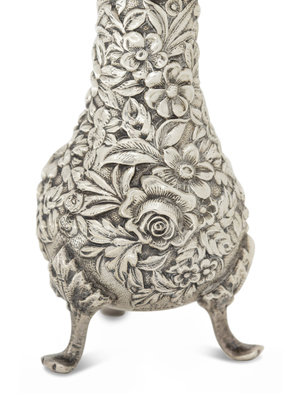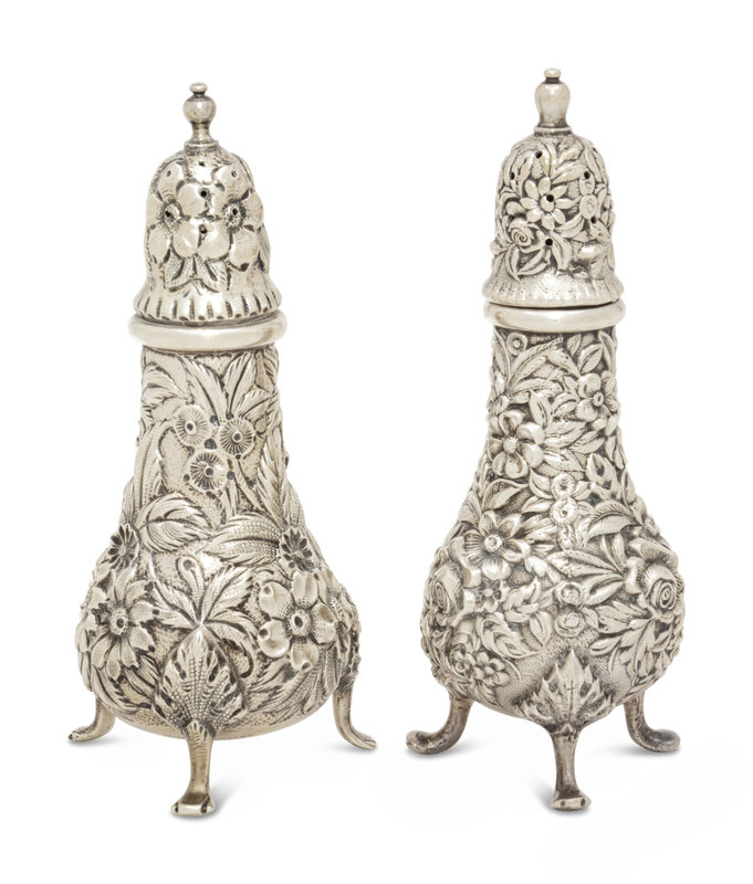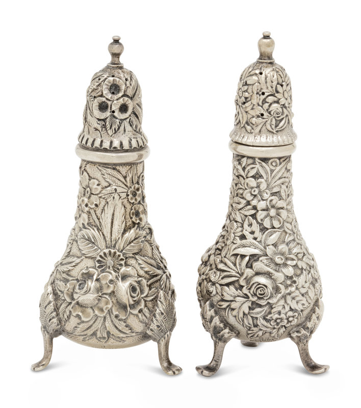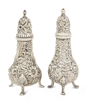 one example marked 'Sterling' and '58' on underside, the other example marked 'Sterling', 'Hand Decorated' and '8' on underside