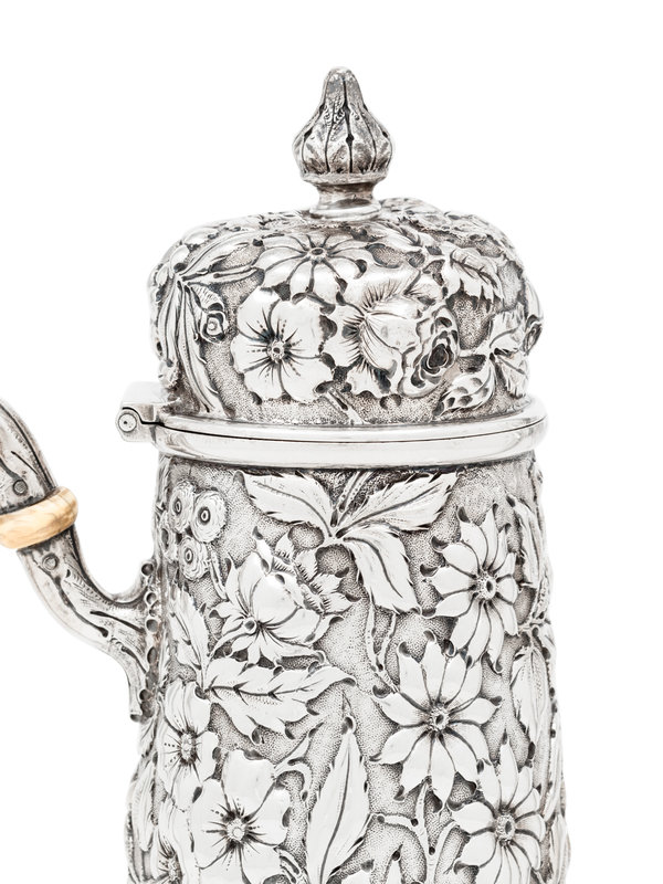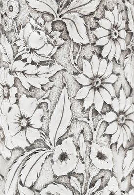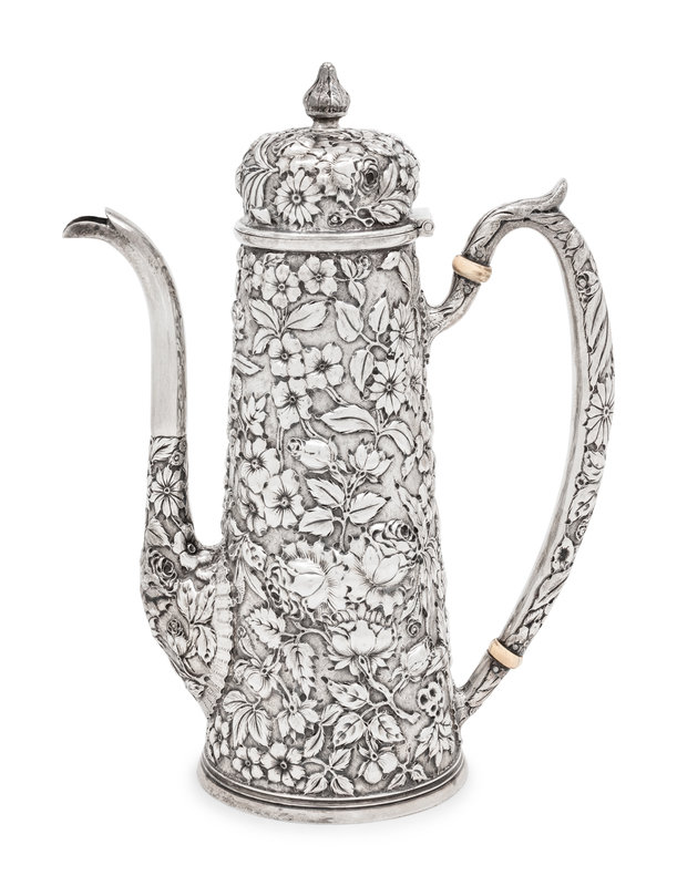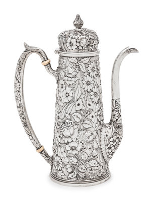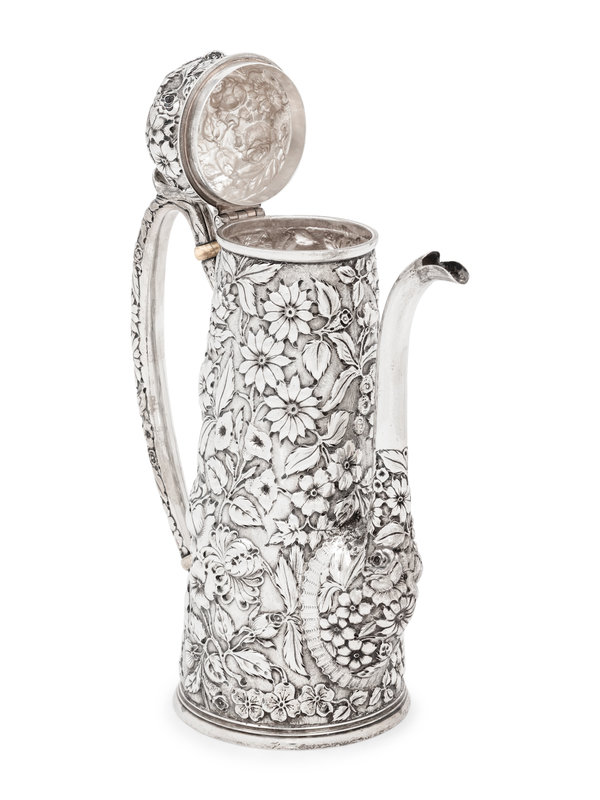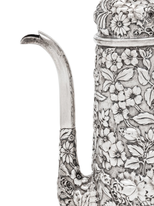 decorated with repoussé floral and foliate motifs throughout.