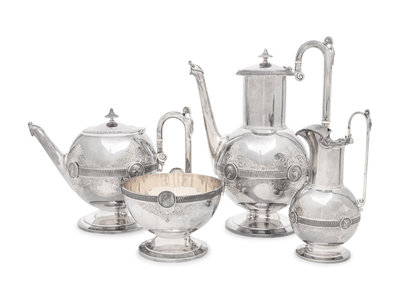 Medallion pattern, comprising a teapot, coffee pot, creamer and sugar, each with engraved monogram 'HR' to the body.