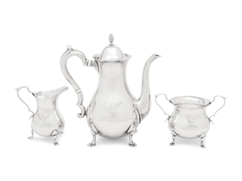 comprising a coffee pot, creamer and open sugar, each with an engraved eagle to the body.