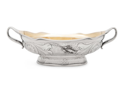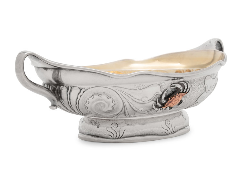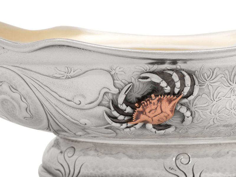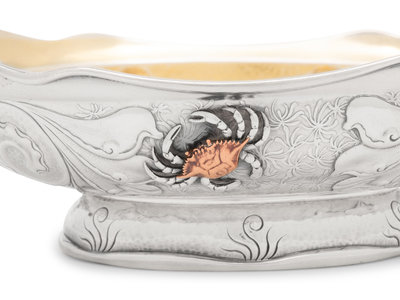 the handles with engraved monogram 'S', the body decorated with an applied mixed-metal crab and other sea fauna.