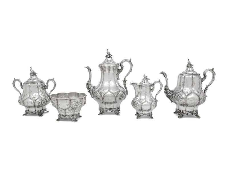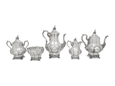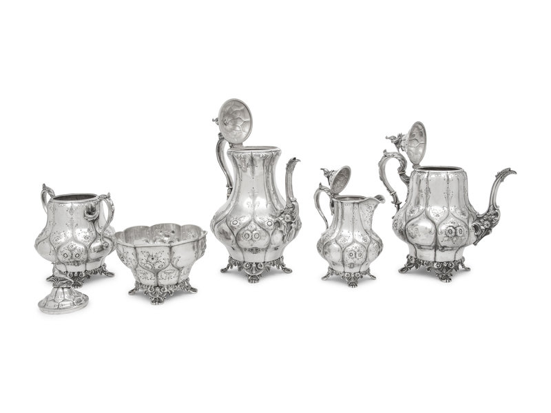 comprising a teapot, coffee pot, creamer, covered sugar and waste bowl, each having engraved monogram 'A' on the body.