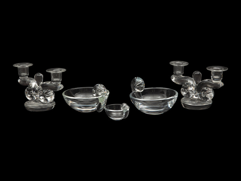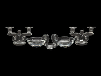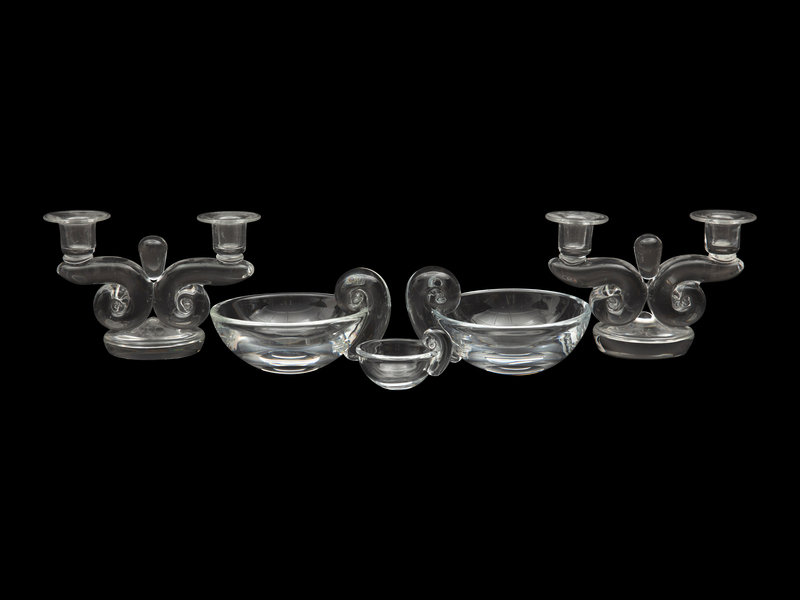 comprising a pair of two-light candelabra, a pair of bowls and a smaller bowl, each etched Steuben to the underside.