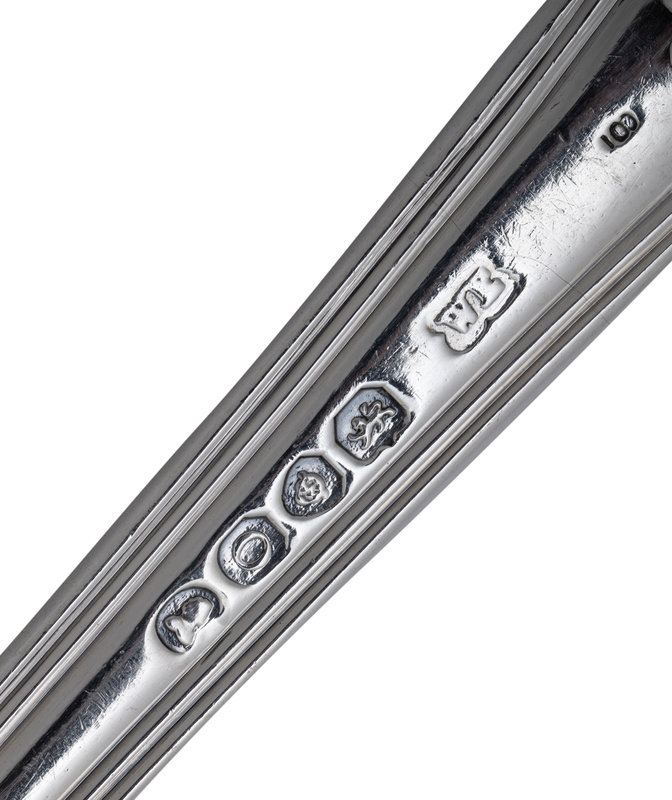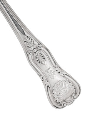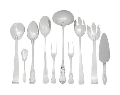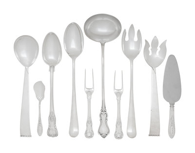 comprising two English silver two-prong carving forks probably by Charles Fox I, London, 1824; a silver pie server and berry spoon in Gadroonette pattern by Manchester Silver Co., Providence, RI; a silver serving spoon probably by William Eaton, London, 1829; an unmarked two-piece silver-plate salad serving set; a two-piece silver-plate salad serving set by Three Crowns Silversmiths, Pottstown, PA and a silver-plate soup ladle; 10 items total.