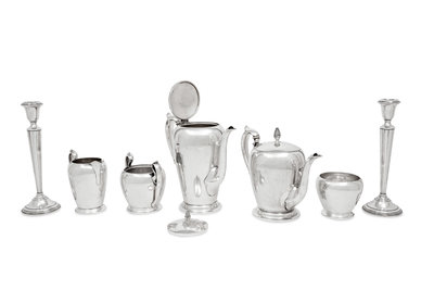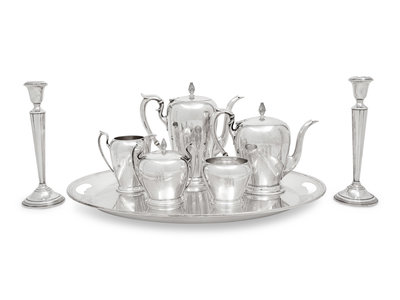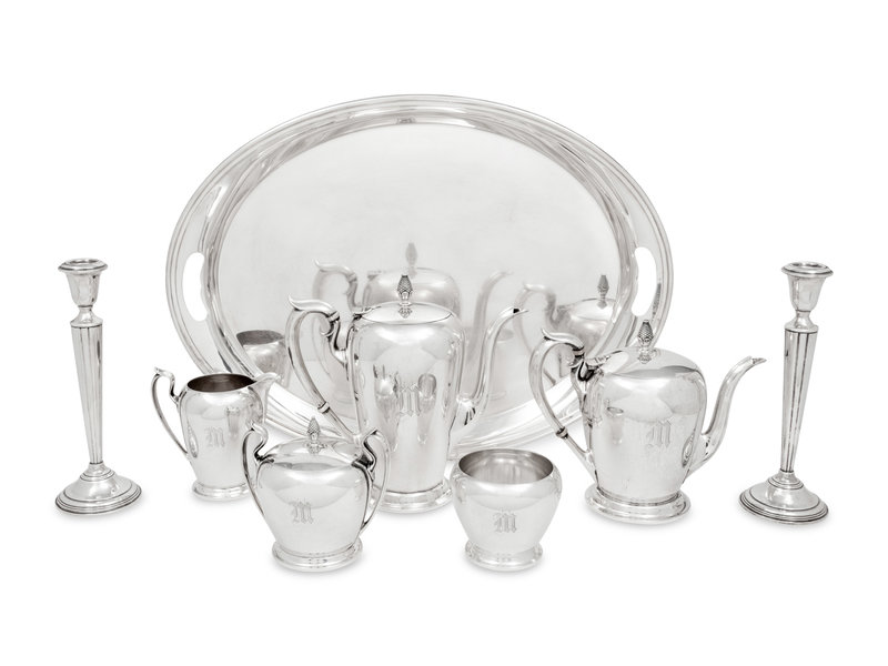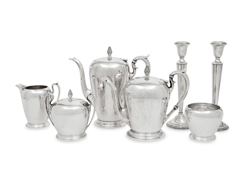 An American Silver Five-Piece Tea and Coffee Service and a Pair of Cartier Silver Candlesticks