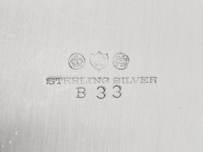 the silver items marked 'Sterling' to underside; the silver-plate tray unmarked