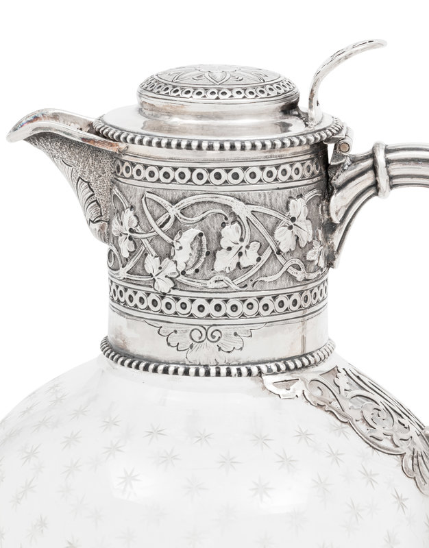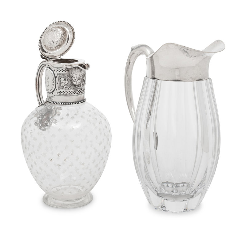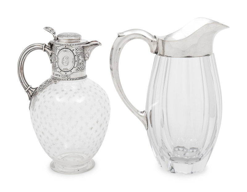 comprising a Victorian claret with engraved monogram 'C' within a circular cartouche on the neck and marked for William and George Sissons, Sheffield, 1863, and a German water pitcher marked for Lazarus Posen, Frankfurt.