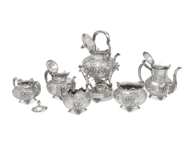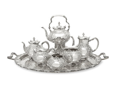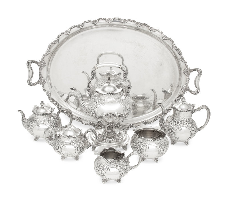 comprising a water kettle on stand, coffee pot, tea pot, creamer, covered sugar, waste bowl and tray.