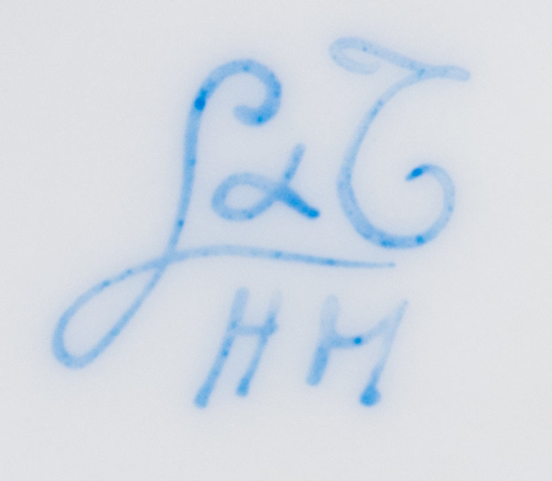 the cups inscribed 'Le Tallec a Paris / France / ofecialement pour / Monsieur Jerome Silverman'; the saucers inscribed 'Desine et peint [illegible] a la main/ pour Le Tallec a Paris France/ ofecialement pour / Monsieur Jerome Silverman' in red to the underside; one saucer stamped 'Limoges France'.