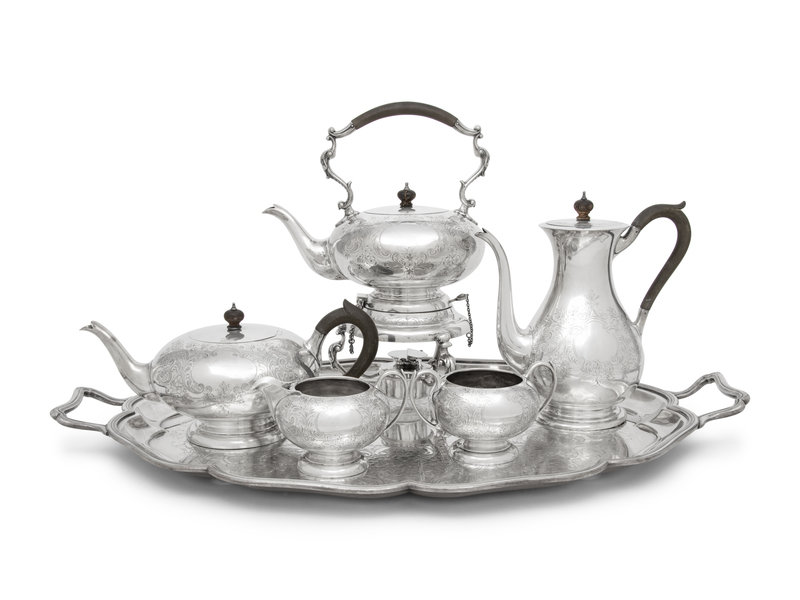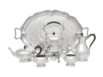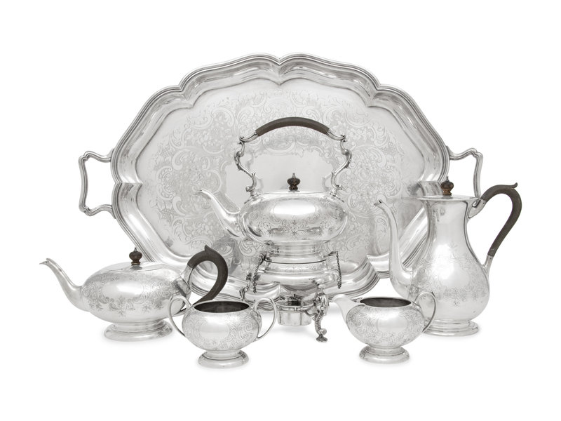 comprising a water kettle on stand, teapot, coffee pot, creamer and sugar, together with an associated silver-plate serving tray; 6 items total.