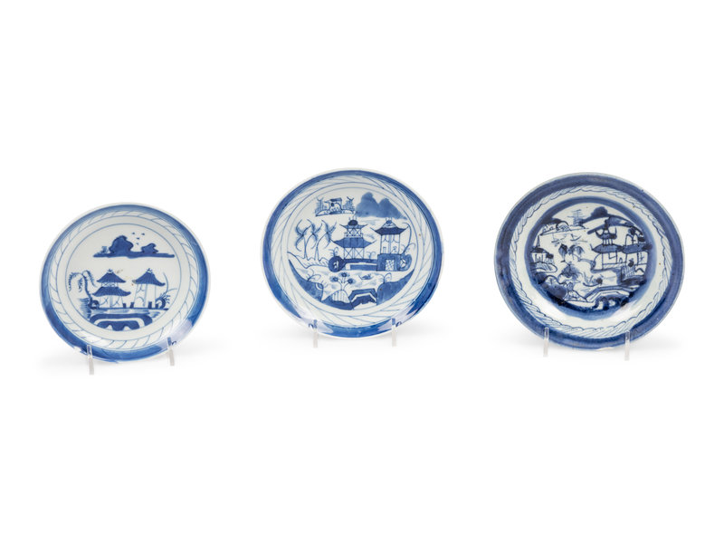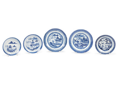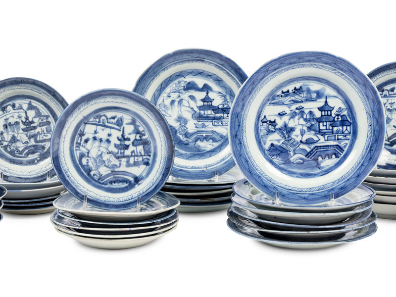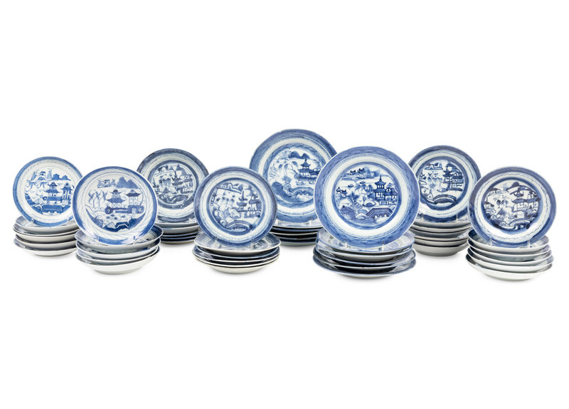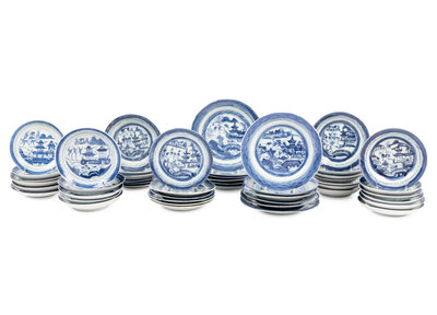 A Group of Forty-Eight Canton Blue and White Porcelain Bread Plates