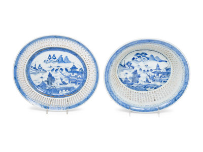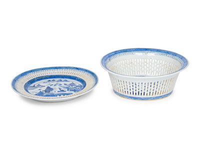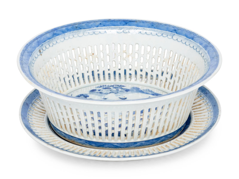 A Canton Blue and White Porcelain Reticulated Basket and Underplate