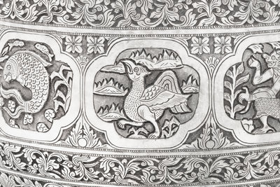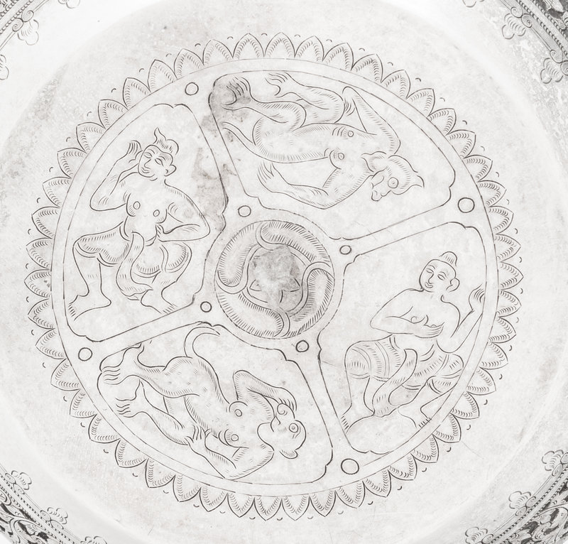 the body decorated with foliate banding and zodiac figures within quatrefoil cartouches.