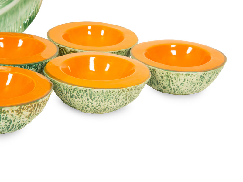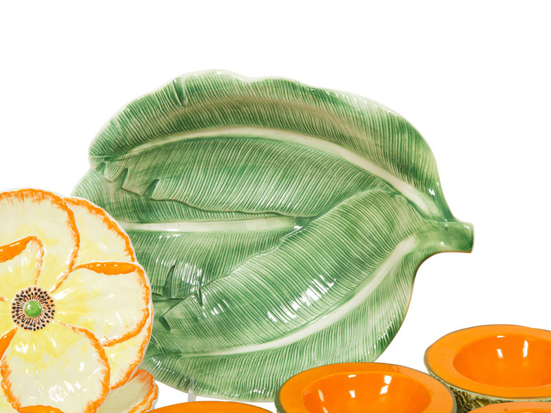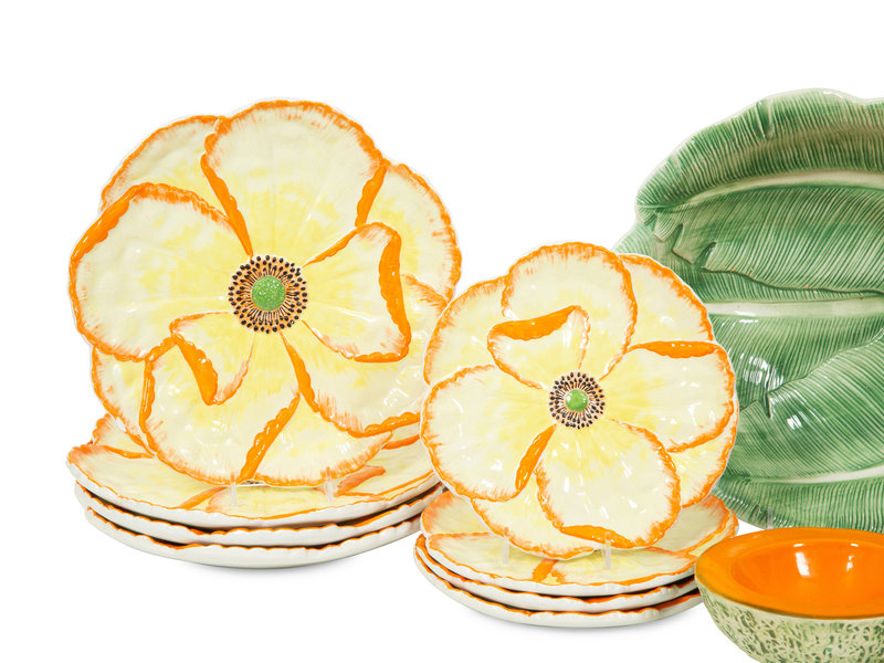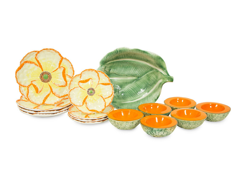 comprising four flower dinner plates and four matching side plates, six cantaloupe bowls and a leaf serving bowl; 15 items total.