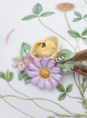 the tureen decorated with Trifolium repens L. and Viola tricolor arvensis S.; the cover decorated with Trifolium fragiferum L.; the platter decorated with Campanula persicifolia L. and incised 3158 to the underside.