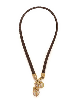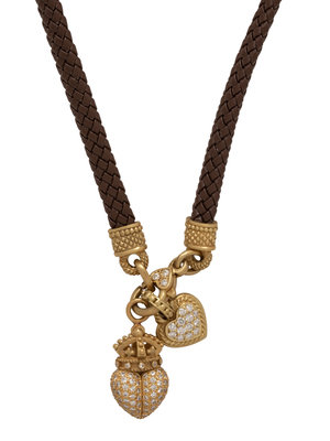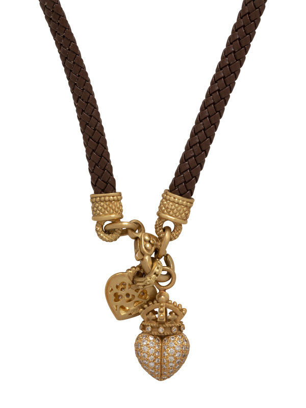 Consisting of a braided leather cord with yellow gold and diamond clasp containing three round brilliant cut diamonds, suspending a heart pendant containing 13 round brilliant cut diamonds weighing approximately 0.55 carat total, together with a Kieselstein-Cord crowned heart pendant containing 140 round brilliant cut diamonds weighing approximately 1.35 carats total. 16 inches long.