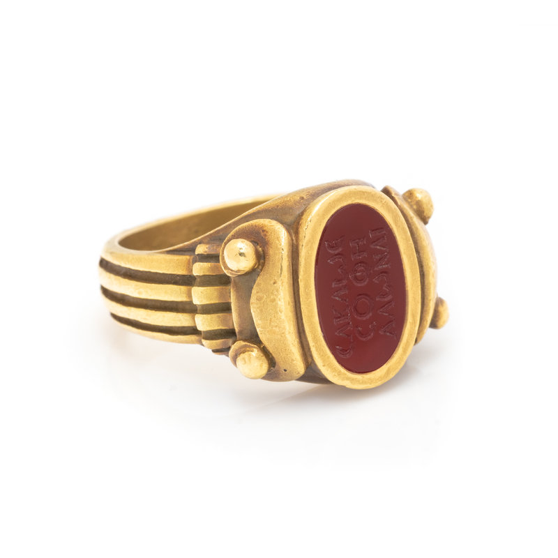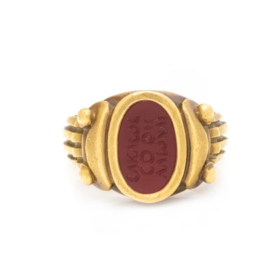 Containing one oval carnelian intaglio measuring approximately 11.80 x 7.40 mm with Greek inscription. Mounted in yellow gold. Ring size 6 1/2.