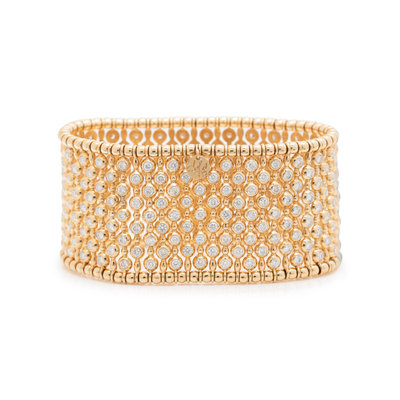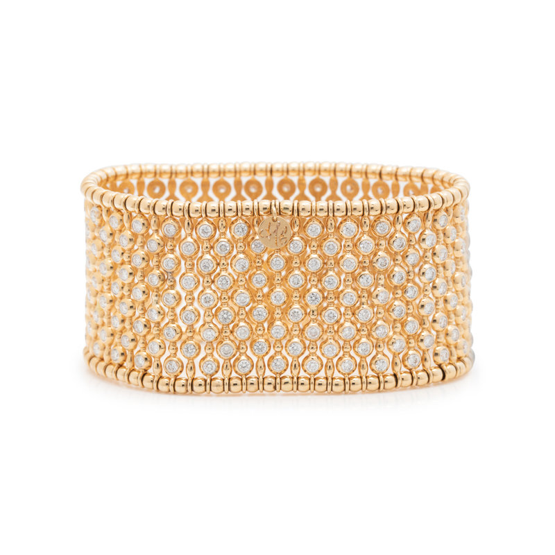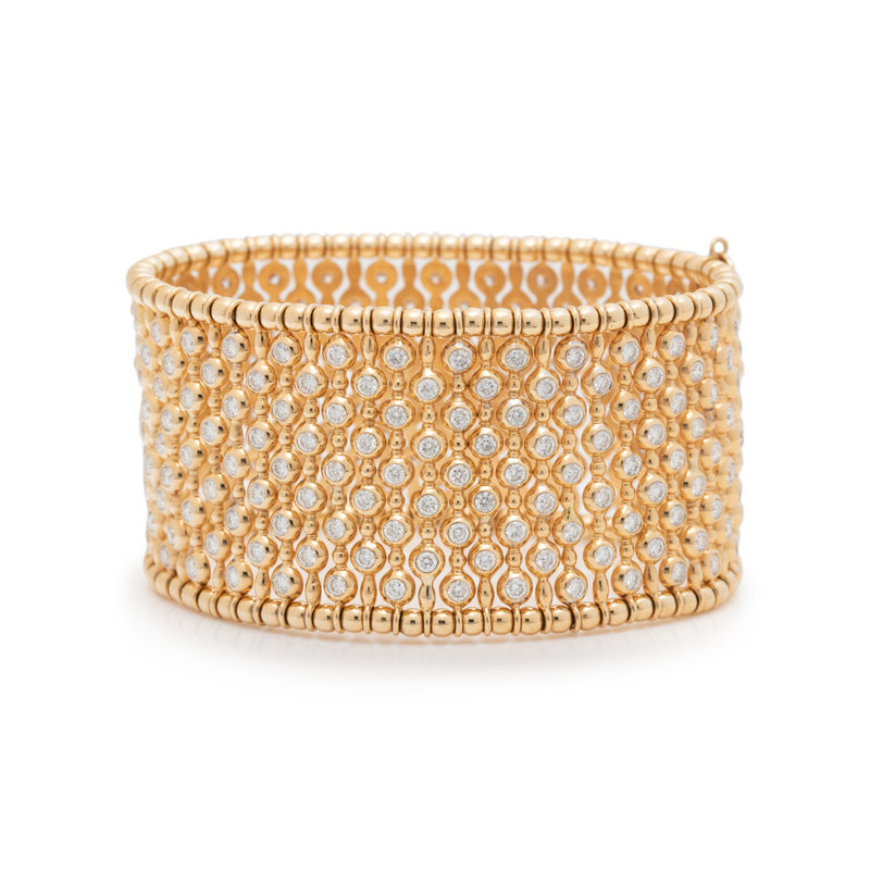 Consisting of a flexible beaded bracelet with linear links containing 261 diamonds weighing approximately 10.40 carats total. 6 1/2 inches inner circumference.