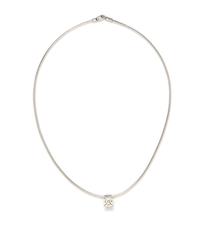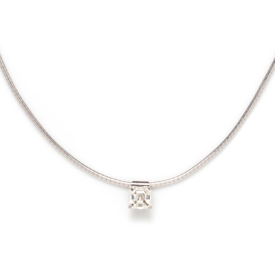 Consisting of an omega chain measuring approximately 1.80 mm wide suspending a pendant containing one Asscher cut diamond weighing 3.06 carats total. Mounted in white gold. 17 inches long.