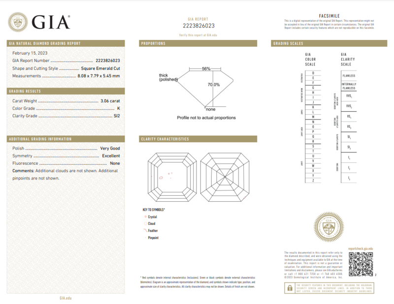 GIA, 2023, Report No. 2223826023, 3.06 carats, K color, SI2 clarity, No fluorescence