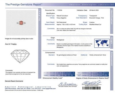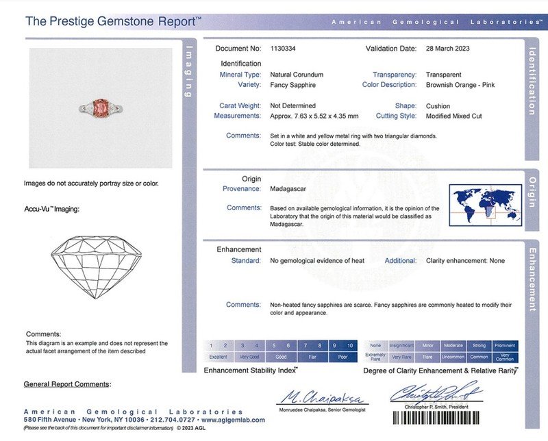 AGL, 2023, Report No. 1130334, Natural Corundum, Fancy Sapphire, Brownish Orange-Pink color, Madagascar, No heat