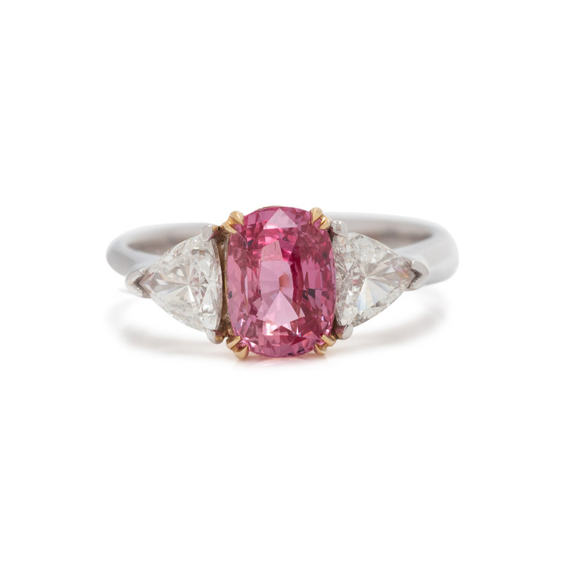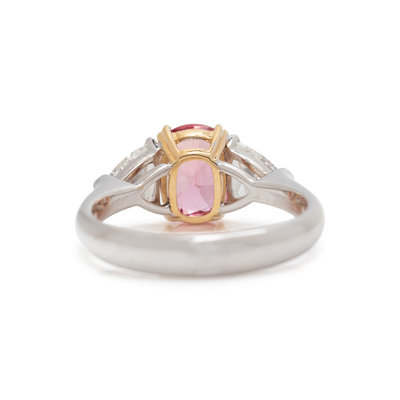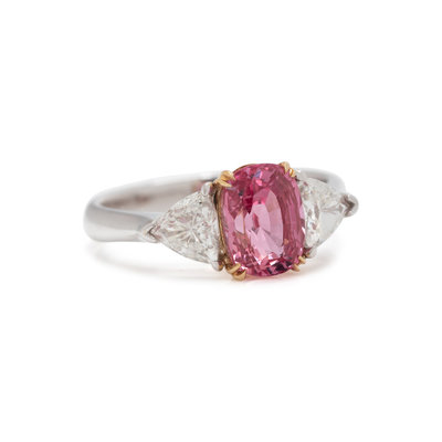 Containing one cushion mixed cut brownish orange-pink sapphire measuring approximately 7.63 x 5.52 x 4.35 mm and two triangular cut diamonds weighing approximately 0.65 carat total. Mounted in bicolor gold. Ring size 5.