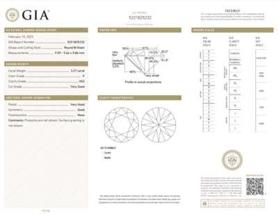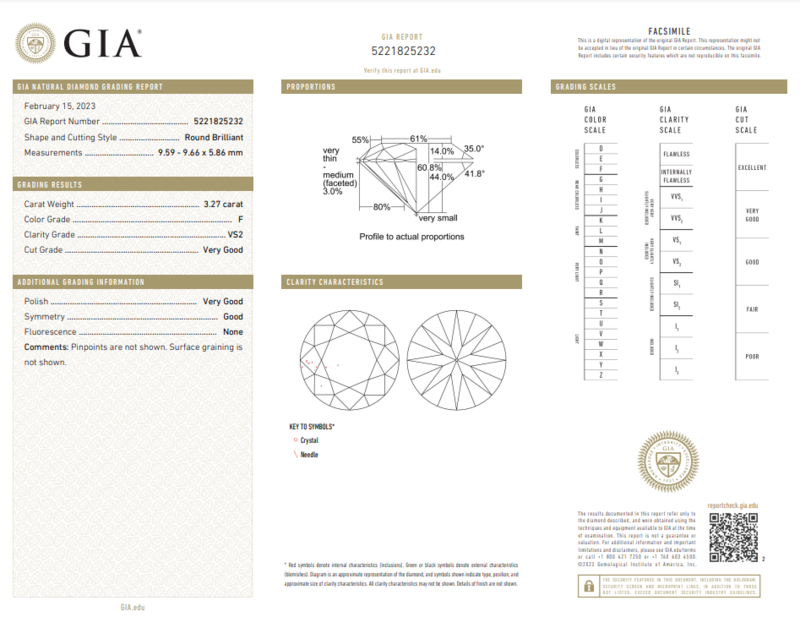 GIA, 2023, Report No. 5221825232, 3.27 carats, F color, VS2 clarity, No fluorescence