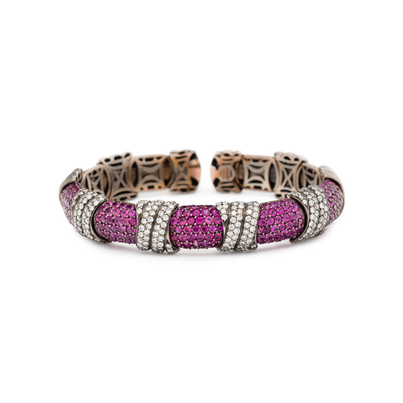 In a flexible cuff design, containing numerous round mixed cut pink sapphires and 208 round brilliant cut diamonds weighing approximately 3.85 carats total. Mounted in blackened gold. 6 1/2 inches inner circumference.