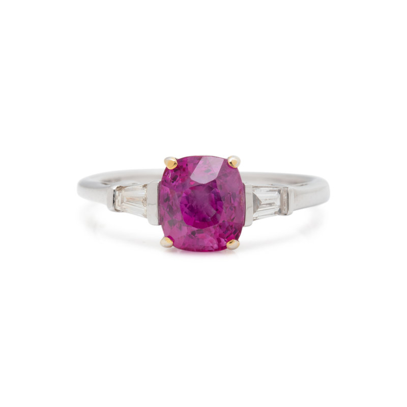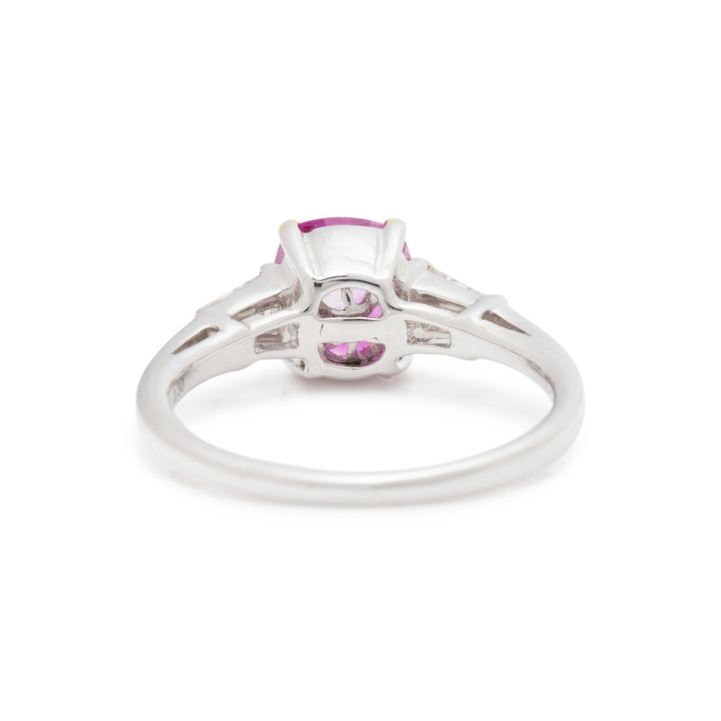 Containing one cushion mixed cut pink sapphire measuring 7.30 x 6.39 mm and two tapered baguette cut diamonds weighing approximately 0.25 carat total. Mounted in white gold. Ring size 6 1/2.