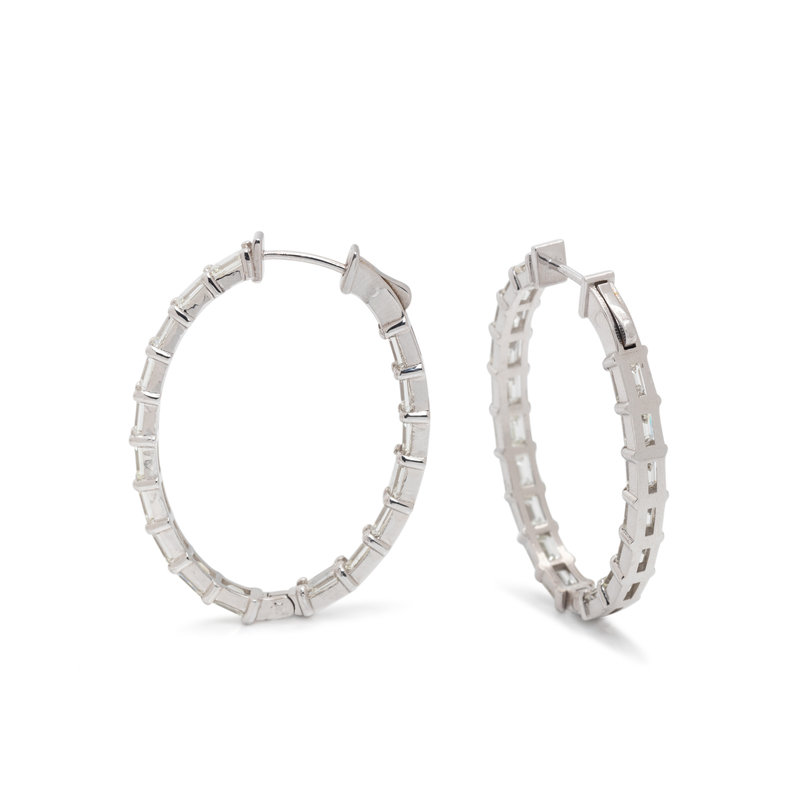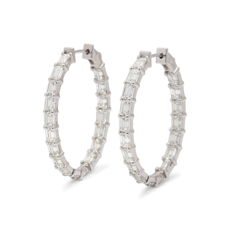 In an inside out style, containing 34 emerald cut diamonds weighing approximately 10.40 carats total. Mounted in white gold. 1 1/2 inches long.