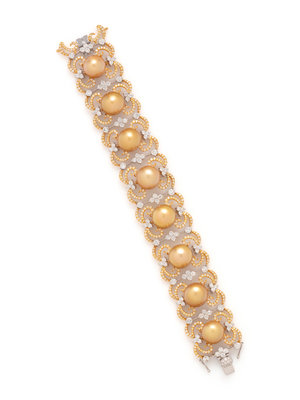 Containing eight golden South Sea pearls measuring approximately 11.50 mm, 112 round brilliant cut diamonds weighing approximately 5.00 carats total and numerous round brilliant cut yellow diamonds (origin of color not tested) weighing approximately 1.75 carats total. Mounted in bicolor gold. 6 1/2 inches long.